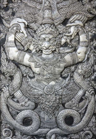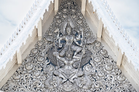 Chiang Mai, Thailand - July, 18, 2025 : Intricate silver relief of Hindu deities on the facade of a temple with detailed floral and mythological patterns at Chiang Mai, Thailand.