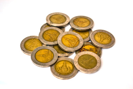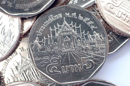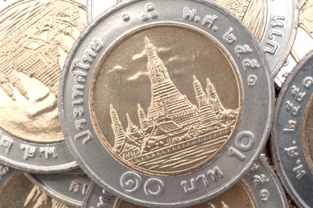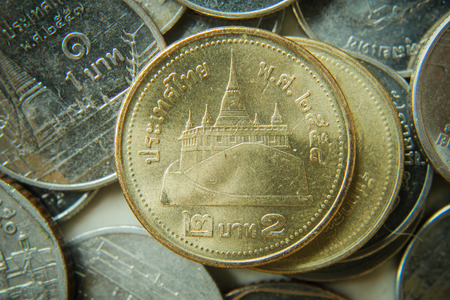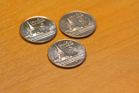 thai coin close-up view on wooden ground,ten bath,spot focus