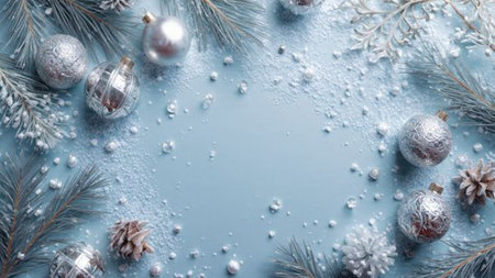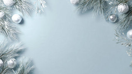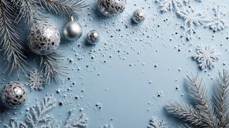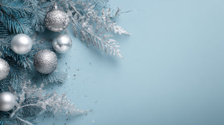 A serene arrangement of silver Christmas ornaments and frosted blue branches against a pale blue backdrop, perfect for holiday decor and winter season themes. Generated A.I.