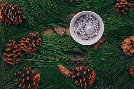 Green pine tree branches, cones background, cup of shiny silver beads, top view. Merry Christmas, Happy New Year