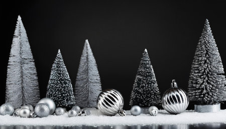 black background with silver christmas trees and ornaments