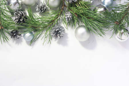 Light Christmas background with silver balls, cones and pine branches on a white background. New Year celebration.