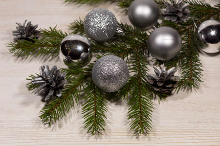 On a light background lies a spruce branch and silvery balls and cones.