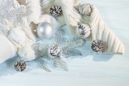 Winter, christmas balls and warm sweater on a wooden table background.