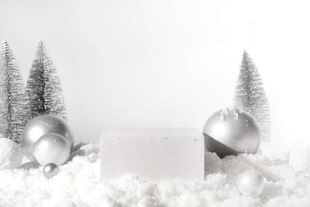 white snow background with pedestal showcase display stage for product mockup with beauty cosmetic skincare for merry christmas festival gift