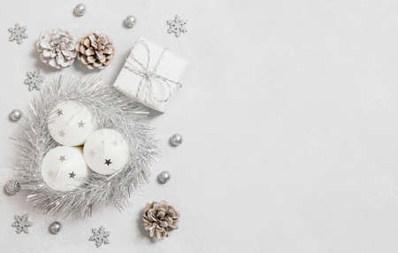 Christmas or New Year background. White gift box, silver balls, pine cones and candles.