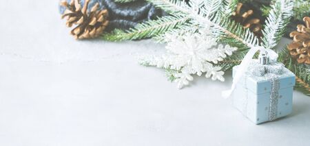 Christmas winter gray background with fir tree branches, pine cones, baubles and snow. New year greeting card in cold colors. Banner image
