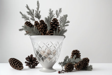 Winter vase with cones and branches. Winter New Year Christmas. frontal blank