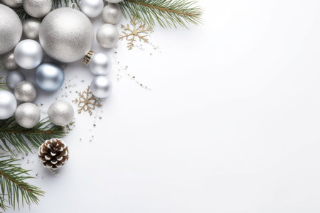 Sparkling silver Christmas ornaments with pine branches and pine cones on a white background. Concept of holiday decoration, festive season, winter celebration, Christmas design. Banner. Copy space.