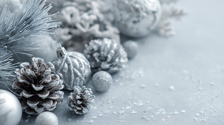 Beautiful arrangement of silver Christmas ornaments, pine cones, and delicate snowflakes against a gray background, perfect for festive holiday designs.