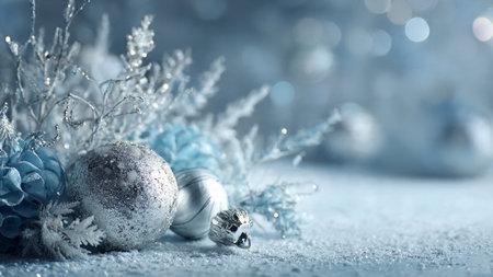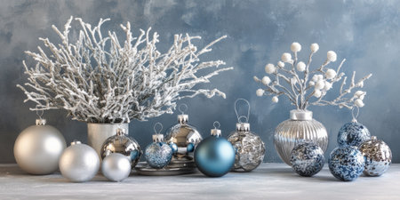 Elegant silver and blue Christmas decorations with a frosty winter backdrop