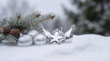 Silver christmas ornaments and pine branch resting on snow with frosted pinecones, showcasing elegant winter holiday decoration.
