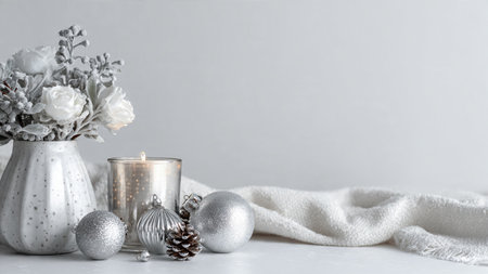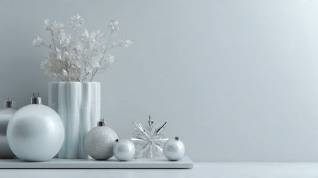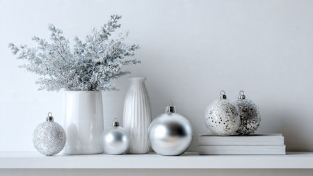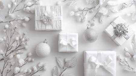 A beautifully arranged festive composition featuring silver ornaments, pine branches, and elegant gift boxes on a soft backdrop, perfect for enhancing holiday themes and moods.