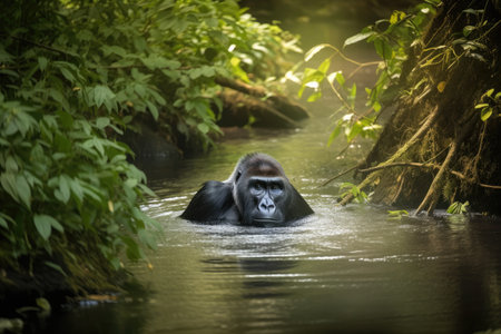 gorilla swimming in tranquil stream, surrounded by lush greenery, created with generative ai