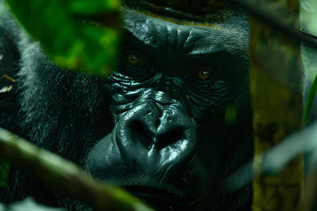 A powerful gorilla peers through greenery, displaying calm strength in its natural habitat during daylight.