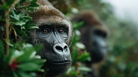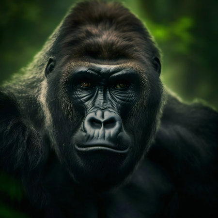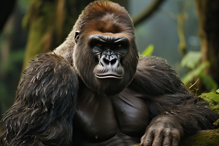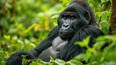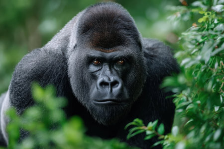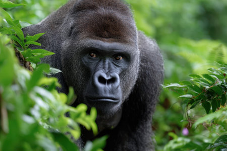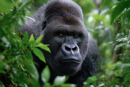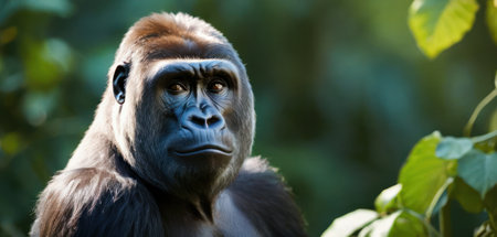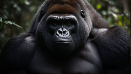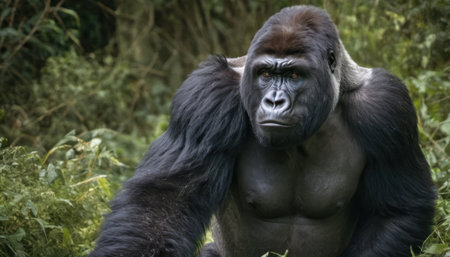 Close-up portrait of a powerful gorilla in its lush rainforest habitat.
