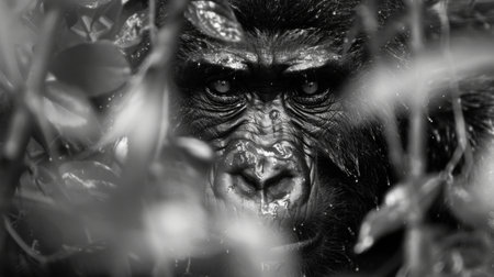A beautiful black and white portrait of a monkey at close range that looks at the camera. Gorilla