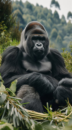 The Quiet Majesty of the Forest: A Silverback Gorilla Sits Amidst Vibrant Greenery, Its Fur a Tapestry of Black and Gray.