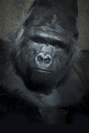Portrait of a male gorilla on a black background, severe silverback, Grave look of the great ape, the most dangerous and biggest monkey of the world. The chief of a gorilla family. APE.