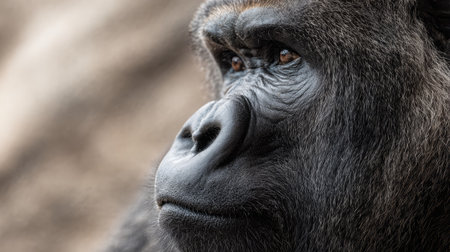This striking portrait reveals a gorillas intense expression and thoughtful gaze capturing its powerful nature.