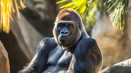 Portrait of a gorilla in the jungle on a sunny day.