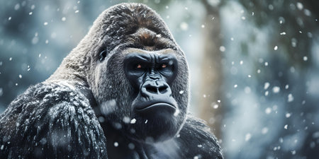 Silverback gorilla stands stoically in snowy landscape showing strength and solitude. Concept Wildlife photography, Nature portrait, Animal in snow, Majestic silverback, Strength and solitude