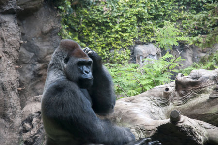 Male gorilla in a natural habitat setting at the zoo, captured in a close-up portrait showing the expressive face of this great ape.