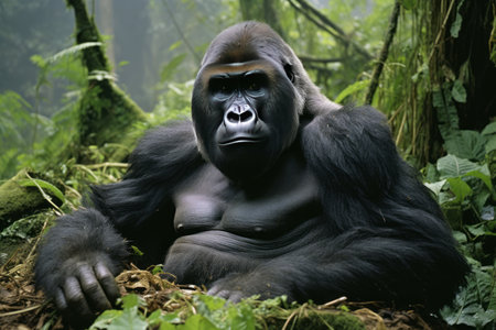 Majestic Silverback Gorilla in its Natural Rainforest Habitat: A Close-up Portrait. Concept Wildlife Photography, Rainforest Ecosystem, Endangered Species Conservation