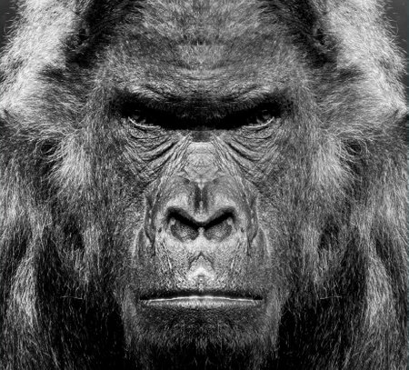 Gorilla portrait in black and white. Closeup of a dangerous-looking silverback.