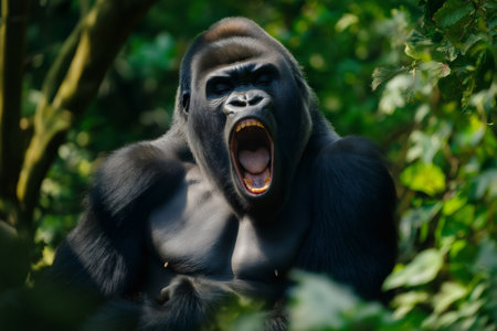 Large male gorilla roaring in lush green jungle vegetation, displaying its power and dominance