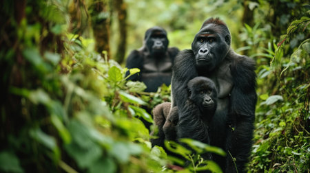 Family of gorillas in the morning forest