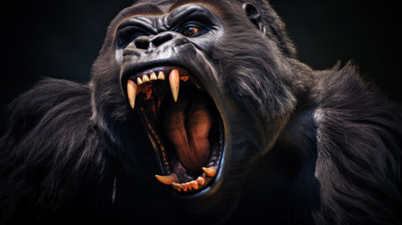 Portrait of a gorilla with open mouth and sharp teeth on black background