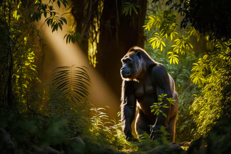 Gorilla standing in the middle of the forest with sunlight coming through the trees. Generative AI.