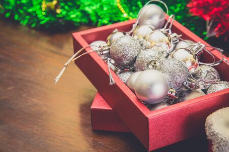 Xmas baubles on wooden table on bokeh background