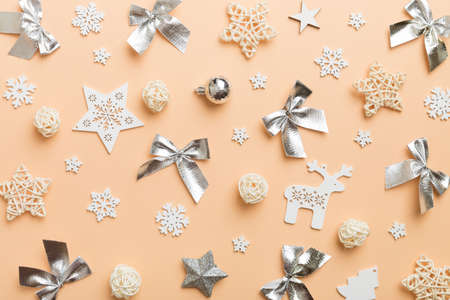 Christmas and New Year background. Festive decoration on white background. Flat lay, top view.