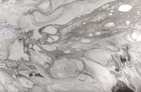 Glitter assortments water. Stone structure. Gel flows. White black silver color sparkling flakes texture paint fluid abstract art background.