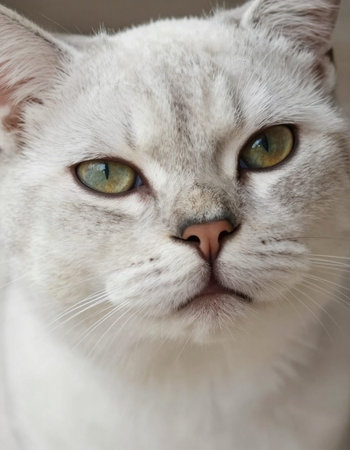 Portrait of a white cat with green eyes close-up.