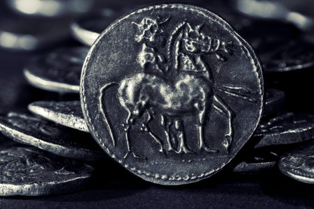 Ancient greek silver coins on reflective surface, selective focus, closeup macro shot