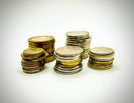 Stacks of silver coins on white background