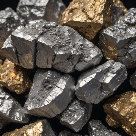 A collection of shiny metallic rocks is stacked together, displaying their brilliant reflective surfaces. The dark background enhances their textures and highlights the shapes of each piece.