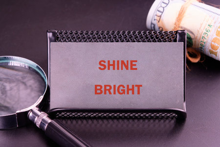 Card with the phrase SHINE BRIGHT stands near a magnifying glass and roll of cash. The message suggests financial prosperity and a close examination of potential.