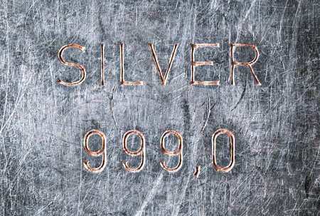 Silver bar stamp impression. Old silver bullion, tarnished and scratched by storage and handling, in which the word SILVER was stamped, as well as 999.0 purity.