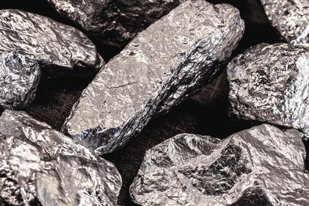 Pile of silver nuggets on white wooden table, closeup