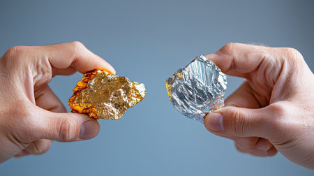Two people holding a gold and silver rock. The two people are holding the rocks in their hands