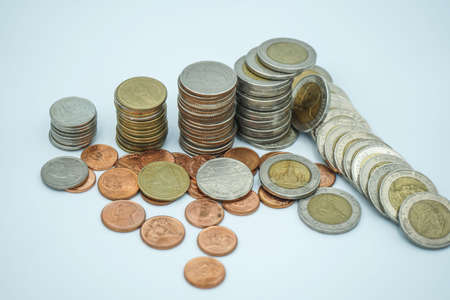 Coin thai bath on white background. Coins and currency of Thailand on the white background.