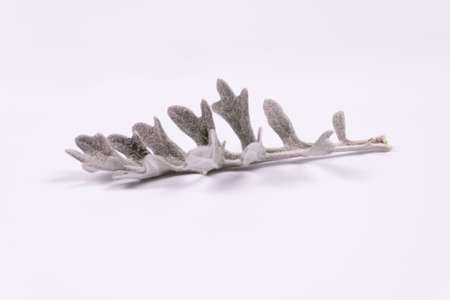 Closeup of silver ragwort, gray background.