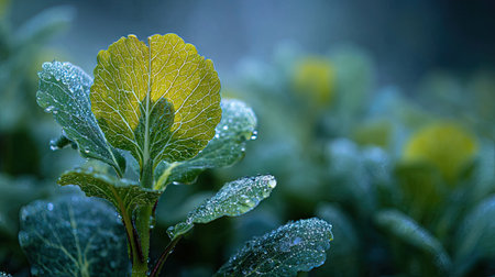 The Leaf mustard in light fog, dew on leaves, light soft diffused, three-quarter view