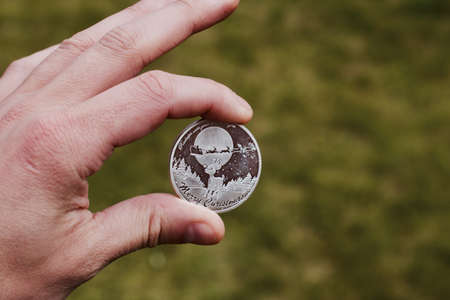 Silver coin with merry christmas inscription in man hand. Green natural background.