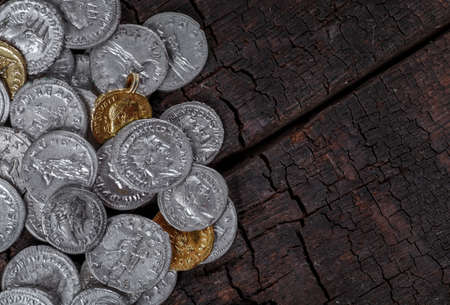 Ancient greek silver coins on reflective surface, selective focus, closeup macro shot