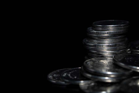 Coins money stack in finance treasury deposit bank account saving, corporate business economy and financial growth by investment in valuable asset to gain cash revenue. Forex trading economy.